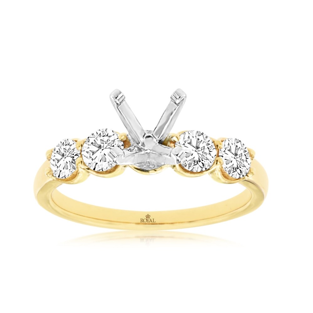 Four round diamonds frame the open center of this semi-mount, positioned in a clean, symmetrical row along each shoulder. The white gold head is designed to hold your chosen center stone, giving the finished piece balance and lift. The contrast of gold and white metal adds quiet depth, keeping the focus exactly where it belongs — on the diamond you choose to make it yours.