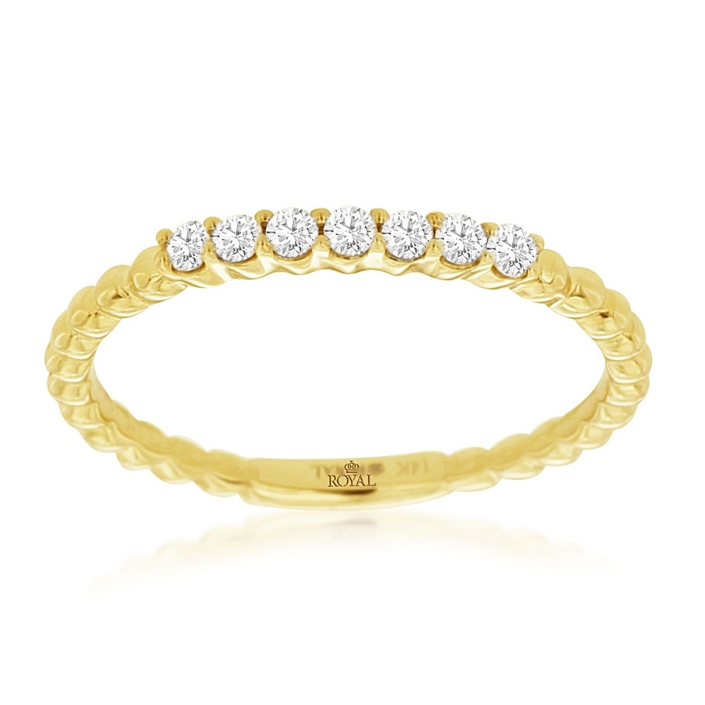 Brilliant round diamonds shimmer across the top of this yellow gold wedding band, each stone prong-set to maximize sparkle and light. The band features a softly braided design, adding subtle texture and depth while maintaining a delicate profile. Both timeless and versatile, it’s a radiant complement to an engagement ring or a refined statement when worn on its own.