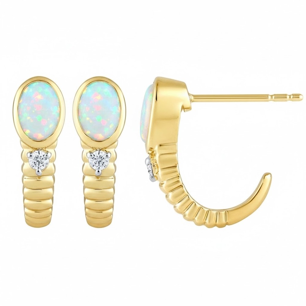 Luminous oval opals glow with soft flashes of green, pink, and blue, framed in warm yellow gold for a radiant contrast. Beneath each opal, a single round diamond adds a crisp accent of brilliance, creating a delicate balance of color and sparkle. The gently curved silhouette features subtle ribbed detailing that brings texture and dimension to the design. Feminine and distinctive, they offer playful light with refined everyday wearability.