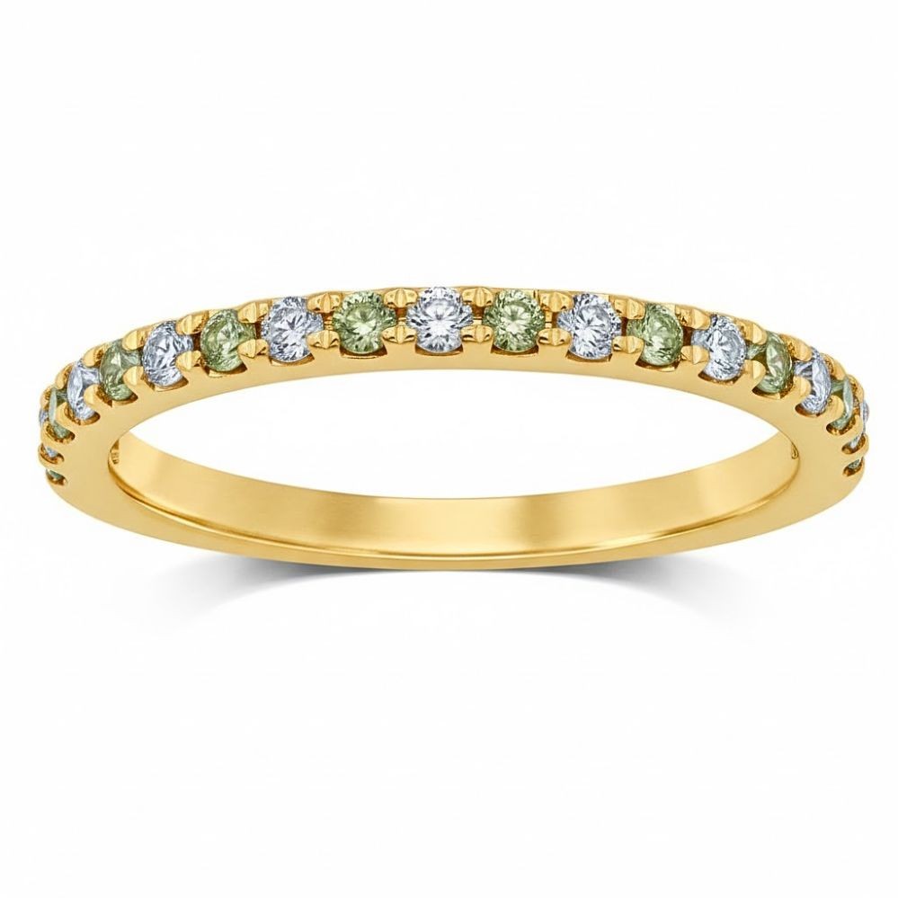 Alternating peridot and round diamonds create a lively pattern of fresh green and bright white sparkle across this slender yellow gold band. The vibrant peridot stones bring a crisp pop of color, while the diamonds add balance and brilliance for a refined finish. Each gem is securely set along the top, forming a graceful line that catches the light with every movement. Cheerful yet elegant, this ring layers beautifully or shines on its own as a subtle statement.