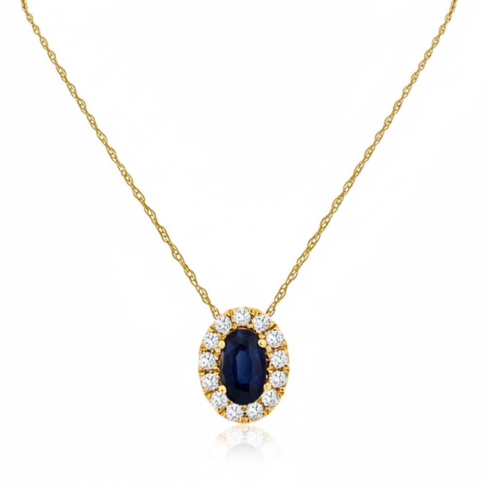 Warm yellow gold frames an oval blue sapphire in a classic halo silhouette, letting the deep color sit at the center with quiet confidence. A ring of bright diamonds traces the outline, adding contrast and lift without overwhelming the sapphire’s presence. The proportions feel balanced and refined, with light catching along the halo as the pendant moves. Finished on a delicate gold chain, it reads timeless, polished, and effortlessly wearable for everyday elegance or layered styling.