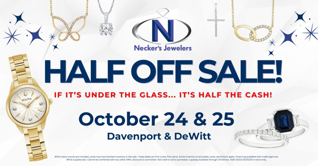 October 24–25, 2025 | DeWitt & Davenport, IA It’s the most dazzling event of the year—Necker’s Jewelers Half Off Sale is back and bigger than ever! For two days only, everything under the glass in our DeWitt and Davenport locations will be 50% off. That’s right—half the price, double the sparkle and right before the holiday season! Whether you’re […]
