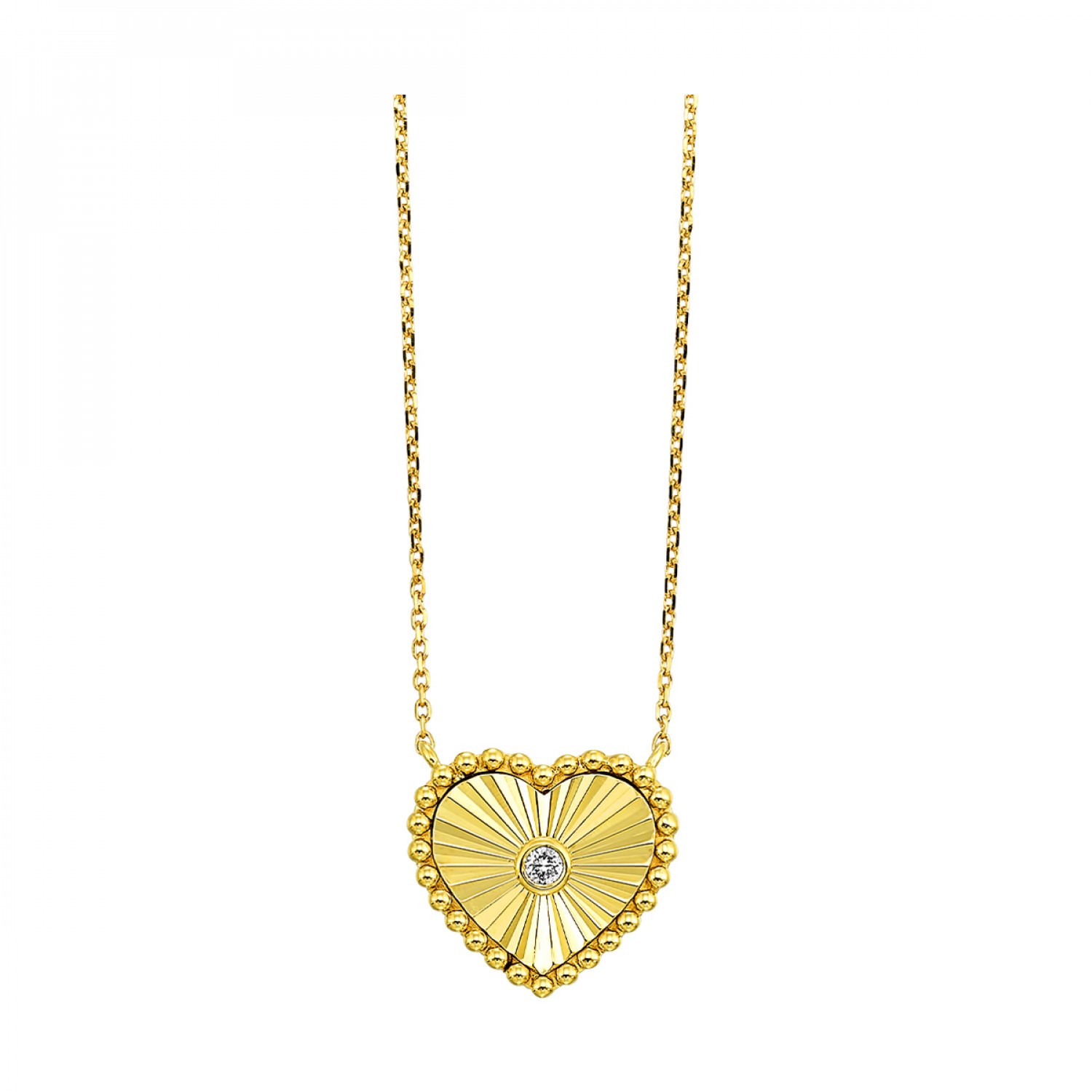 This radiant gold necklace features a heart-shaped pendant with intricate detailing. A dazzling diamond is set at the center, surrounded by a sunburst design that adds dimension and brilliance. The outer edge of the pendant is adorned with delicate gold bead accents, creating a timeless and elegant look. Suspended from a fine gold chain, this piece is a perfect blend of sophistication and charm, suitable for both everyday wear and special occasions.
