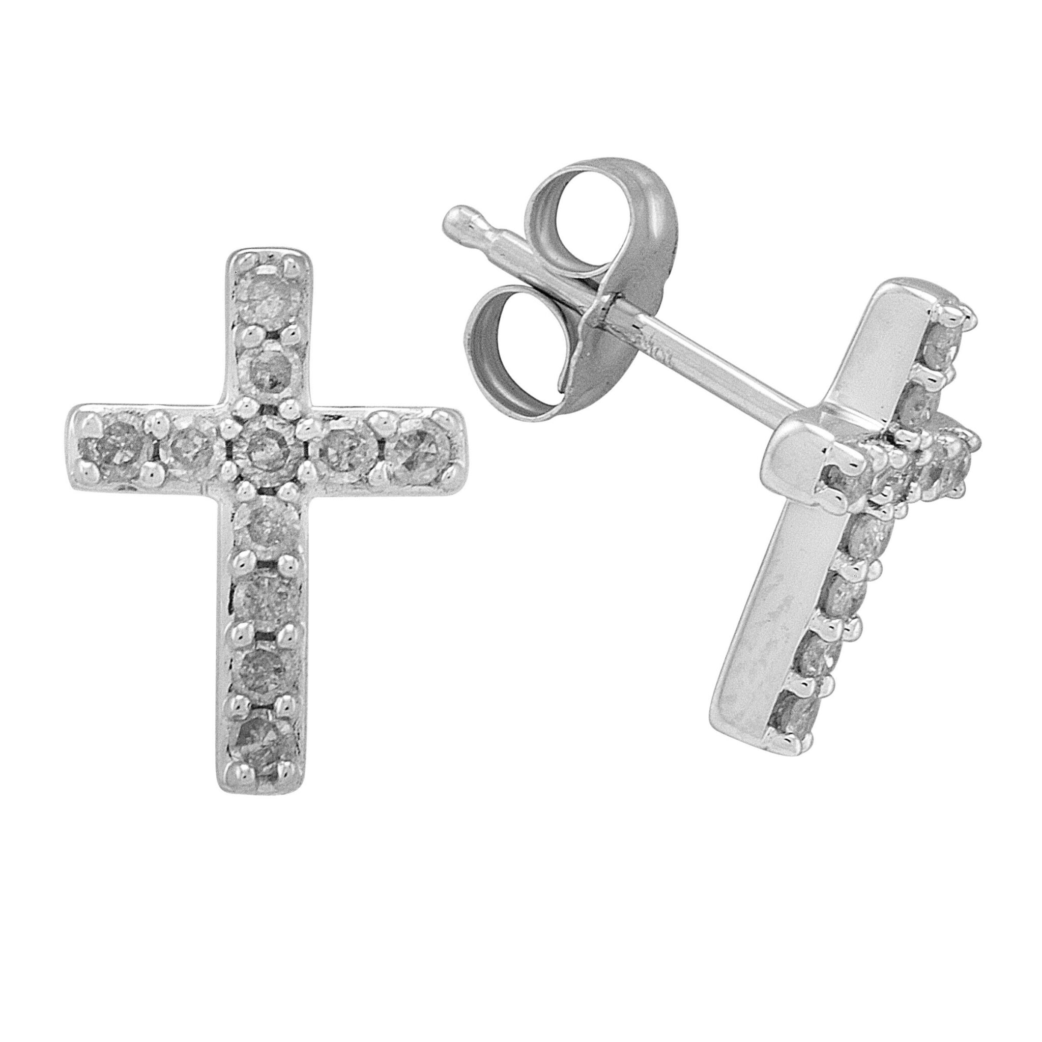 Rows of pavé diamonds totaling approximately 0.18 carat trace petite cross silhouettes that sit flush on the lobe, their 10K white gold frames disappearing so each facet can flash crisp brilliance with every turn of your head. The crosses are anchored to straight posts with classic friction backs for day-to-night security and a barely-there profile that layers easily with hoops or drops. Diamond color and clarity are not specified.