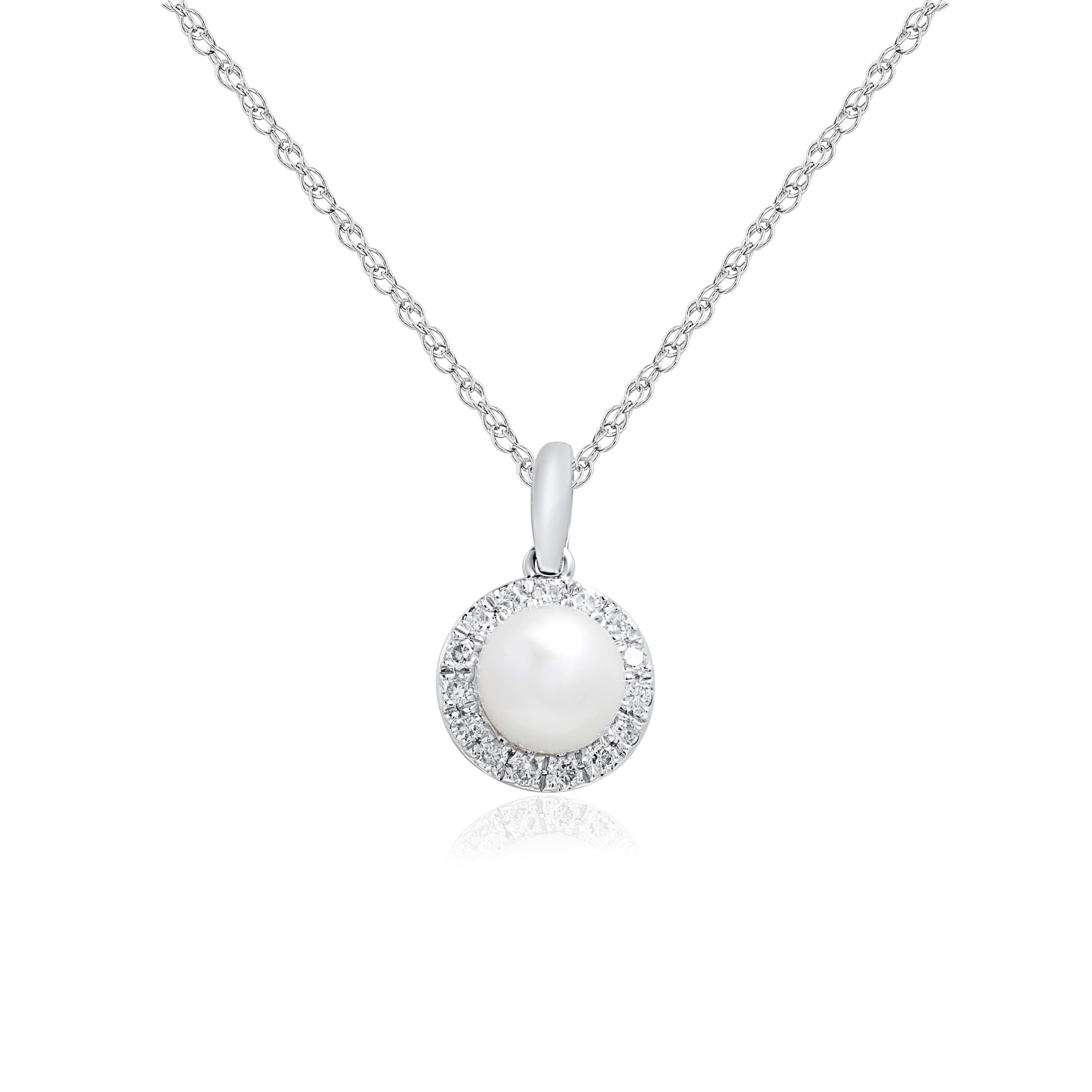 Centered on a luminous white pearl, a tender halo of approximately 0.12-carat pavé diamonds radiates crisp fire from its 10K white gold bezel, so every breath sends a contrast of liquid luster and pinpoint brilliance across the décolletage. The petite pendant hangs from a polished tapered bail, keeping it mobile yet balanced on the included rope-style chain. Pearl species, exact diameter, chain length, and diamond color or clarity are not specified.
