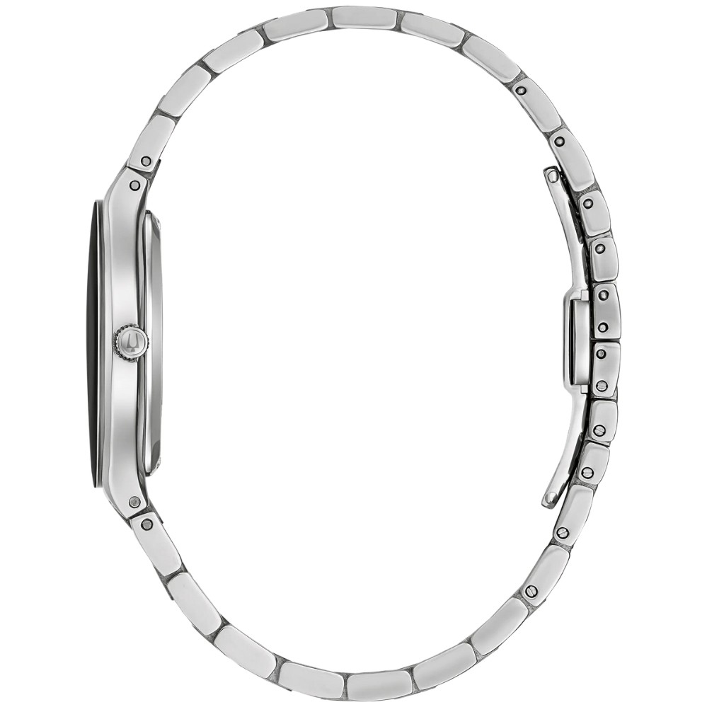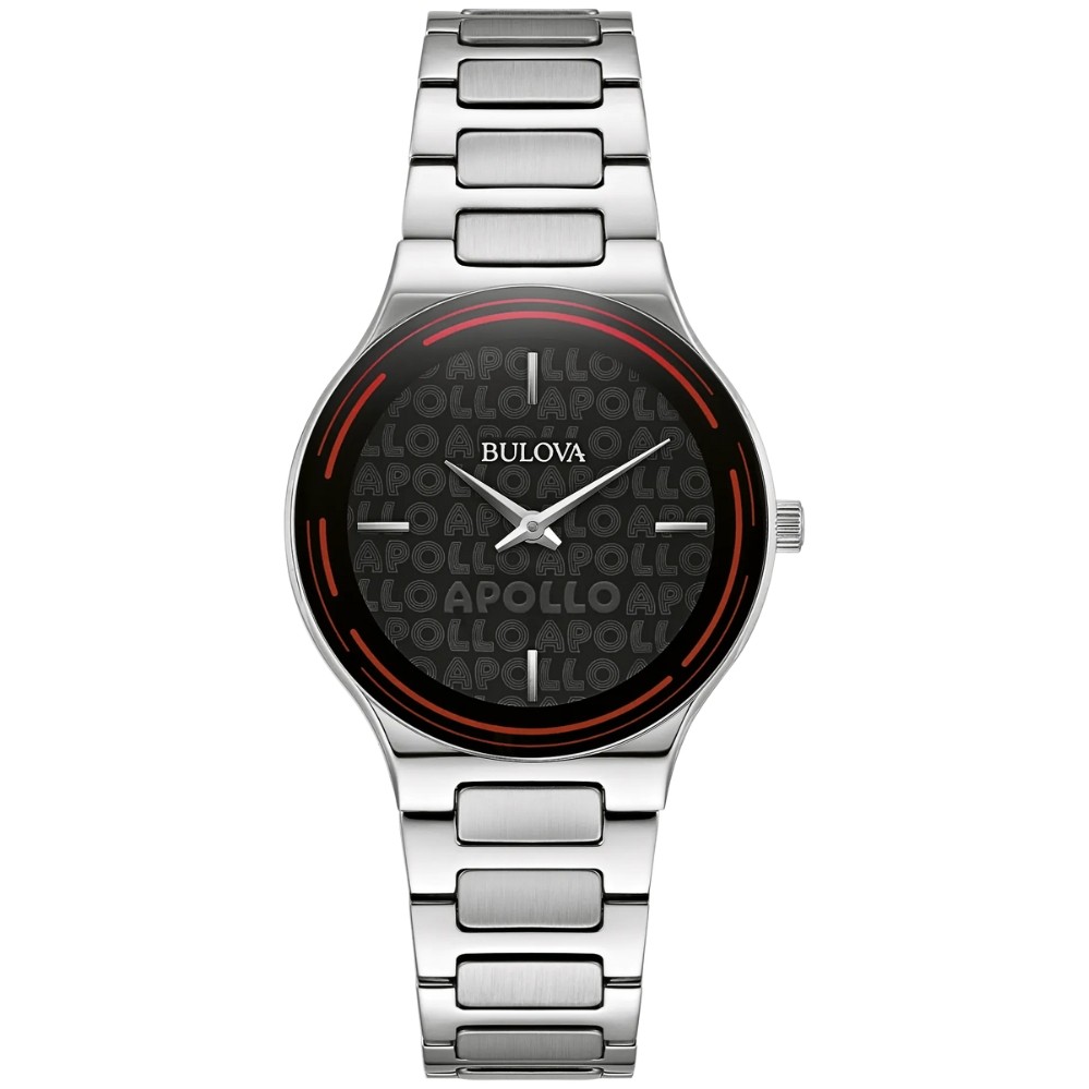 A sleek, modern timepiece inspired by the legacy of Apollo missions, this stainless steel design merges minimalist lines with a subtle space-age flair. The black dial features a repeating ‘APOLLO’ motif beneath a smooth mineral crystal, accented by a striking red perimeter ring for a touch of cosmic energy. Its polished bracelet flows seamlessly into the slim case, creating a bold yet refined silhouette that captures both innovation and understated style.