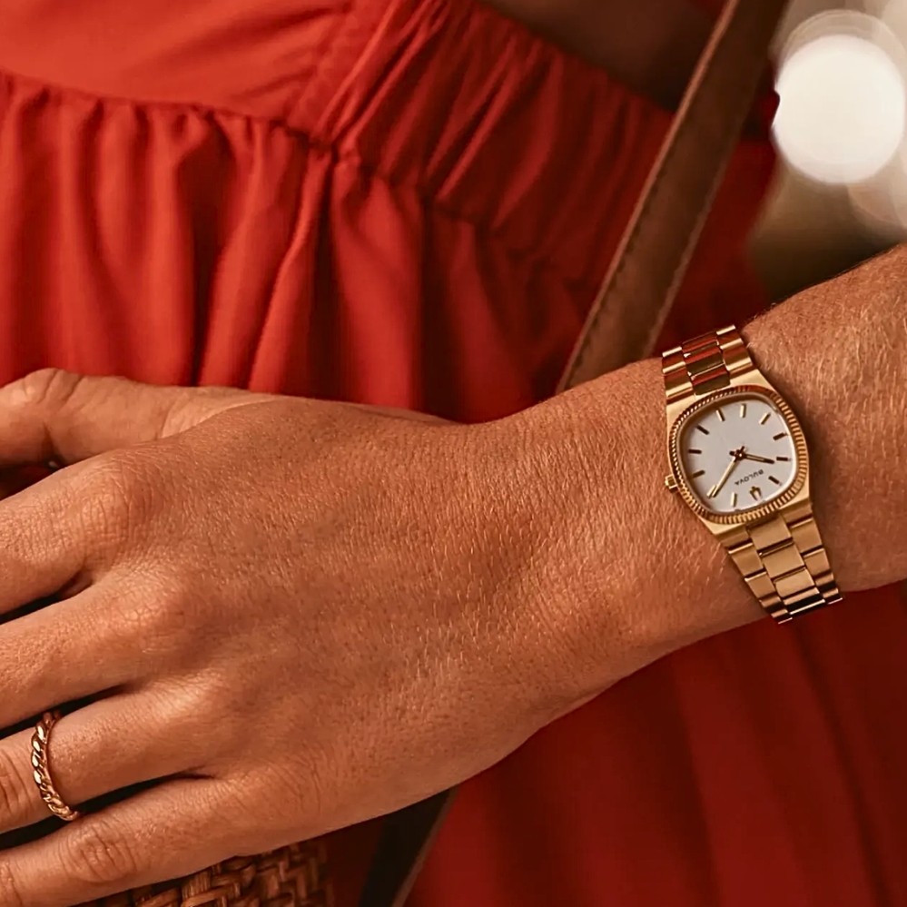 Product Description: A softly contoured gold-tone case frames a silver-white dial with refined vertical texture, creating a subtle contrast that feels both w
