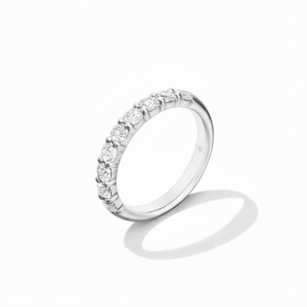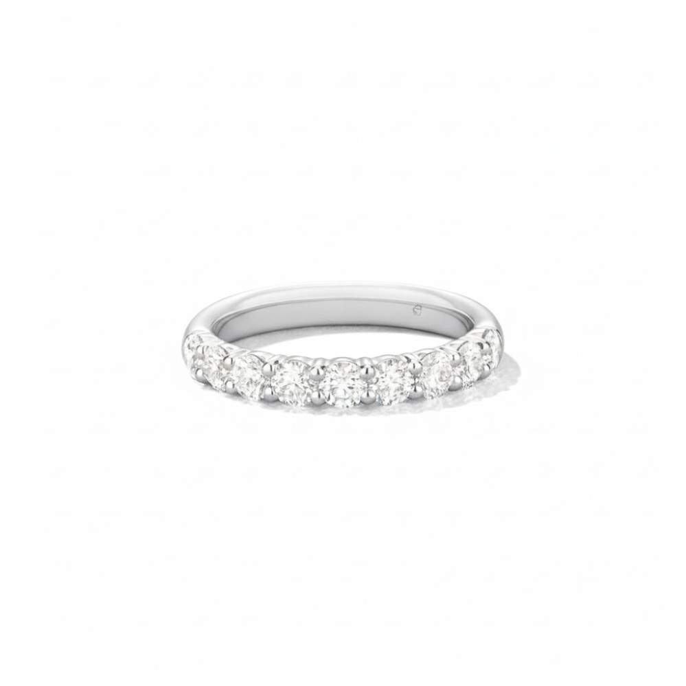 A graceful row of round diamonds creates a clean, continuous line of brilliance across the top of the band, each stone evenly spaced and secured in polished white metal. The shared-prong setting allows light to move freely between the diamonds, enhancing sparkle while keeping the profile refined and wearable. Smooth, gently rounded edges give the ring a comfortable feel for everyday wear.