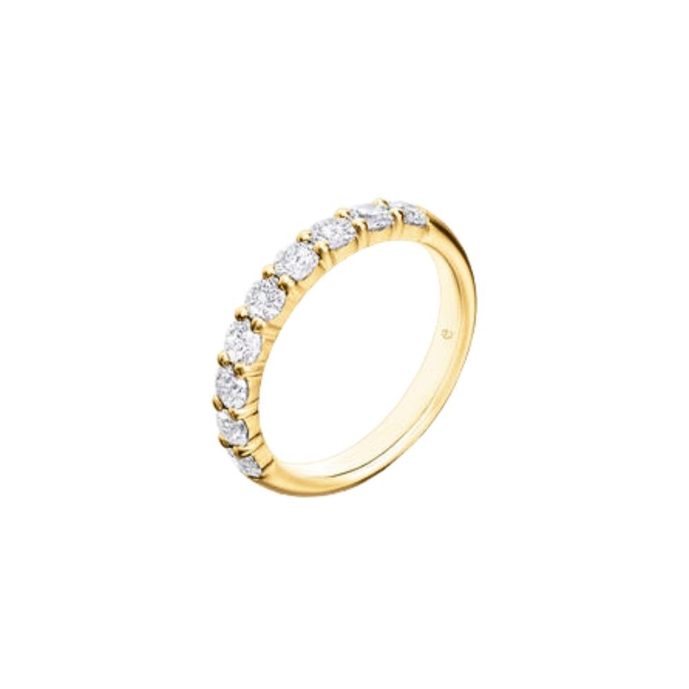 Timeless elegance meets radiant brilliance in this stunning yellow gold band. Crafted from 18K yellow gold, it features nine dazzling round diamonds, meticulously prong-set to maximize their sparkle. The graceful design ensures each diamond shines brilliantly, creating a classic yet versatile piece perfect for celebrating life’s milestones or adding a touch of sophistication to your everyday style.