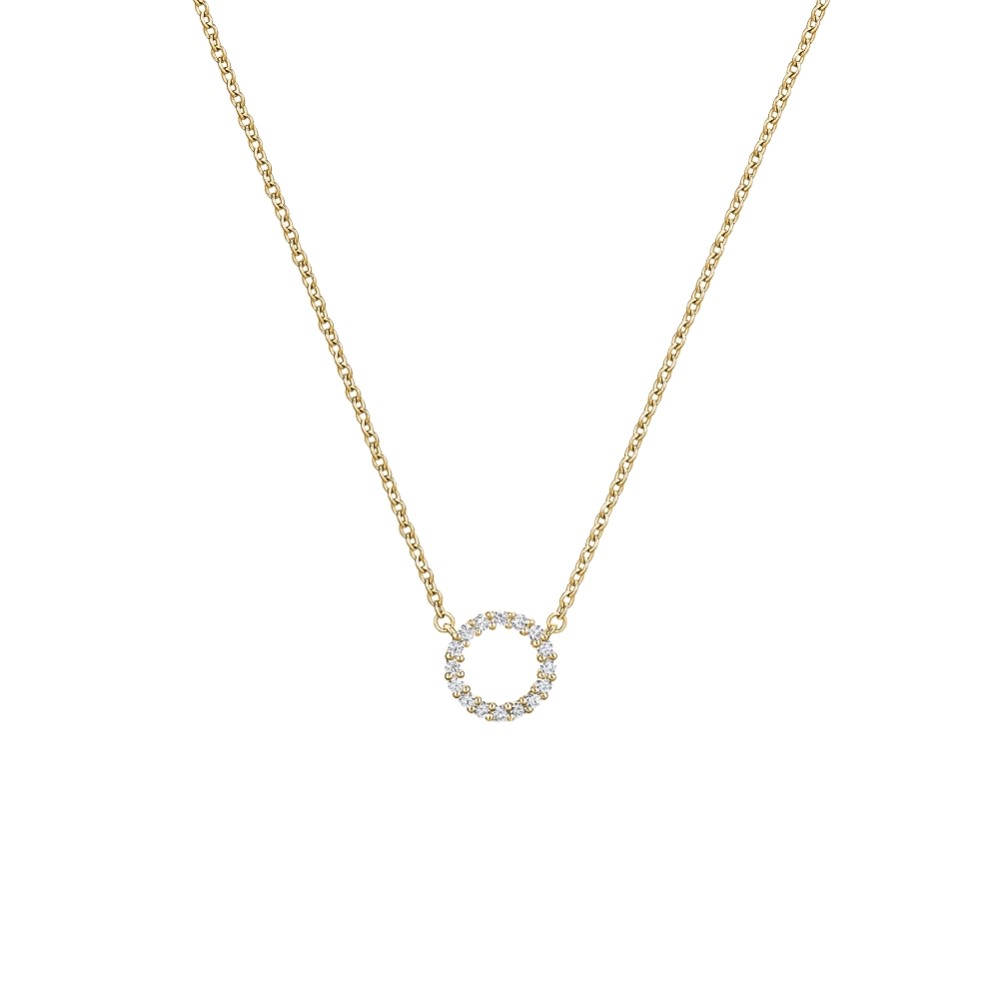 Product Description: A delicate circle of round diamonds is framed in warm yellow gold, creating a soft contrast that enhances the sparkle of each stone. The open center keeps the look light and modern, while the continuous diamond halo delivers balanced brilliance from every angle. Suspended from a fine matching chain, the design rests gracefully at the collarbone. Elegant on its own and effortless to layer, it offers a refined touch of everyday luxury without feeling overstated.