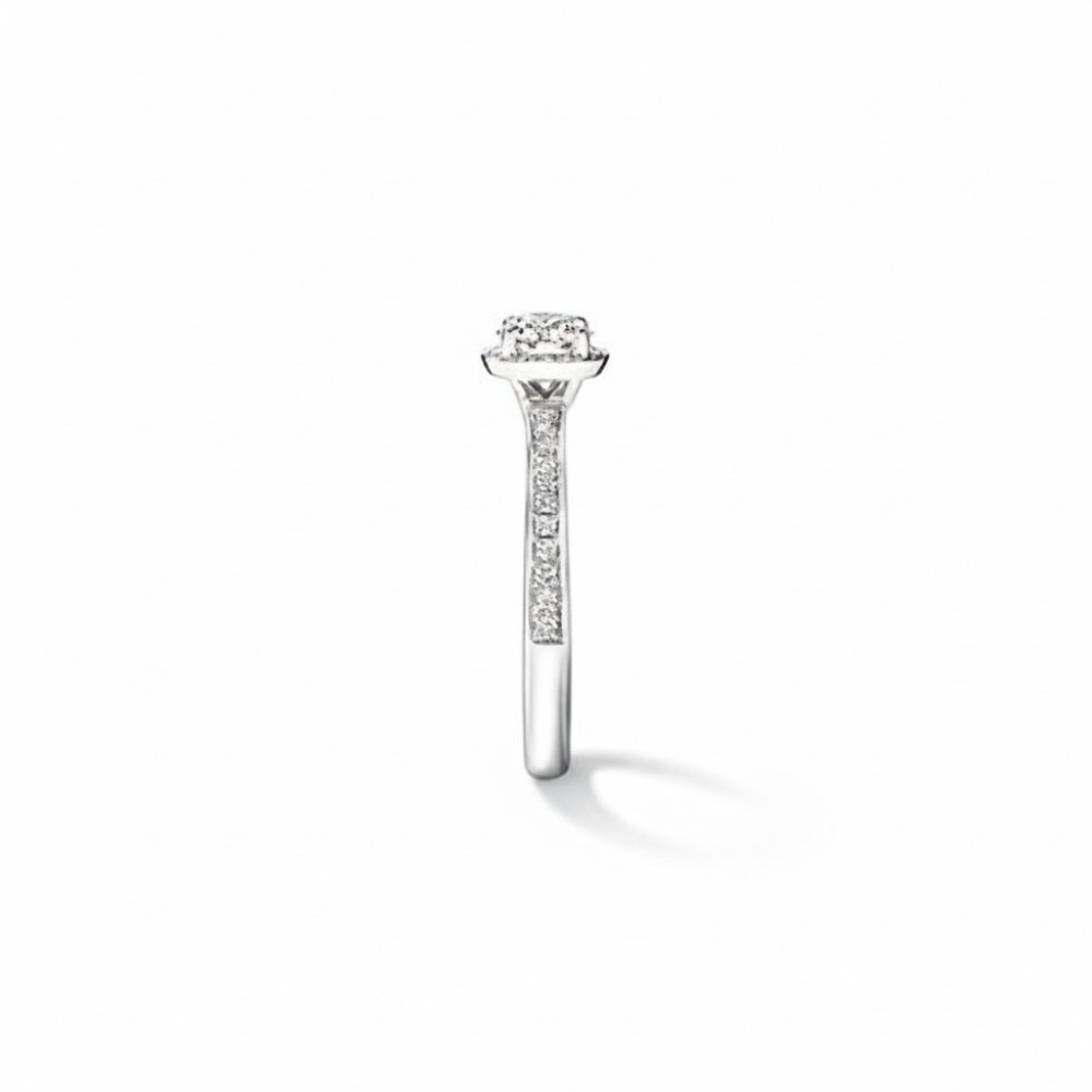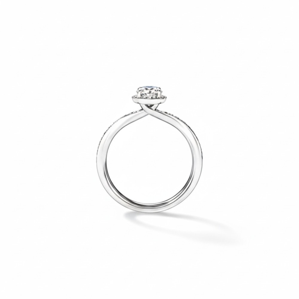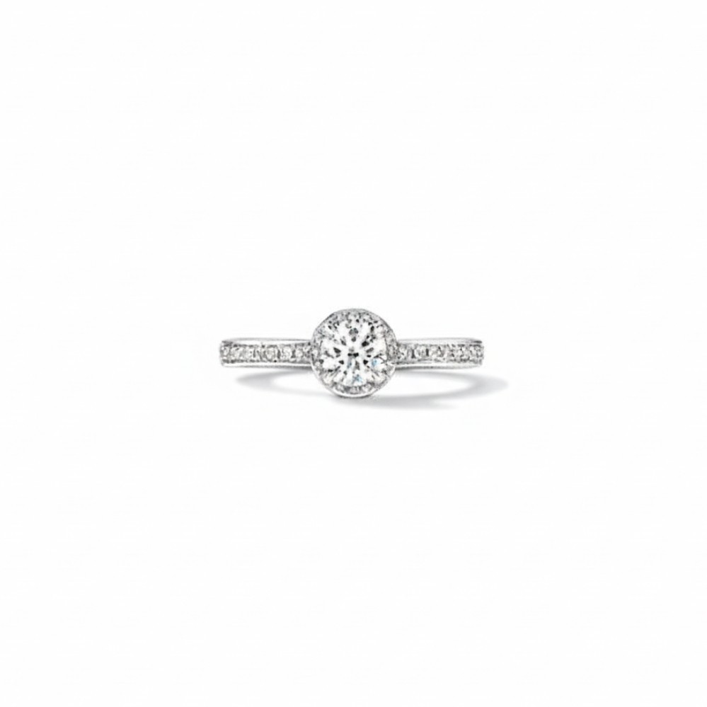 Product Description: A round brilliant center diamond takes focus in this timeless design, encircled by a delicate hidden halo that adds dimension and intensified sparkle from every angle. Crafted in platinum, the setting offers a naturally bright white finish that enhances the fire and brilliance of the diamonds. A slender band lined with pavé-set diamonds creates a seamless flow of light along the finger. Refined, balanced, and enduring, it delivers classic elegance with subtle, modern detail.