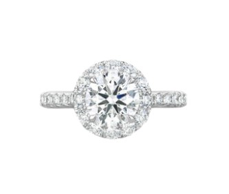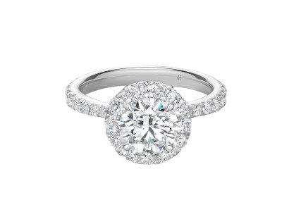 A breathtaking expression of timeless elegance, this engagement ring captivates with its radiant beauty. At its center, a brilliant round diamond is cradled in four delicate prongs, allowing light to dance across its facets for an extraordinary display of fire and brilliance. Surrounding the centerpiece, a halo of meticulously set diamonds enhances its size and sparkle, creating a mesmerizing effect. The band, adorned with a row of shimmering diamonds, adds to the ring’s luxurious appeal, ensuring brilliance from every angle. Crafted in polished precious metal, this design is a true celebration of love and commitment, blending classic sophistication with modern refinement.