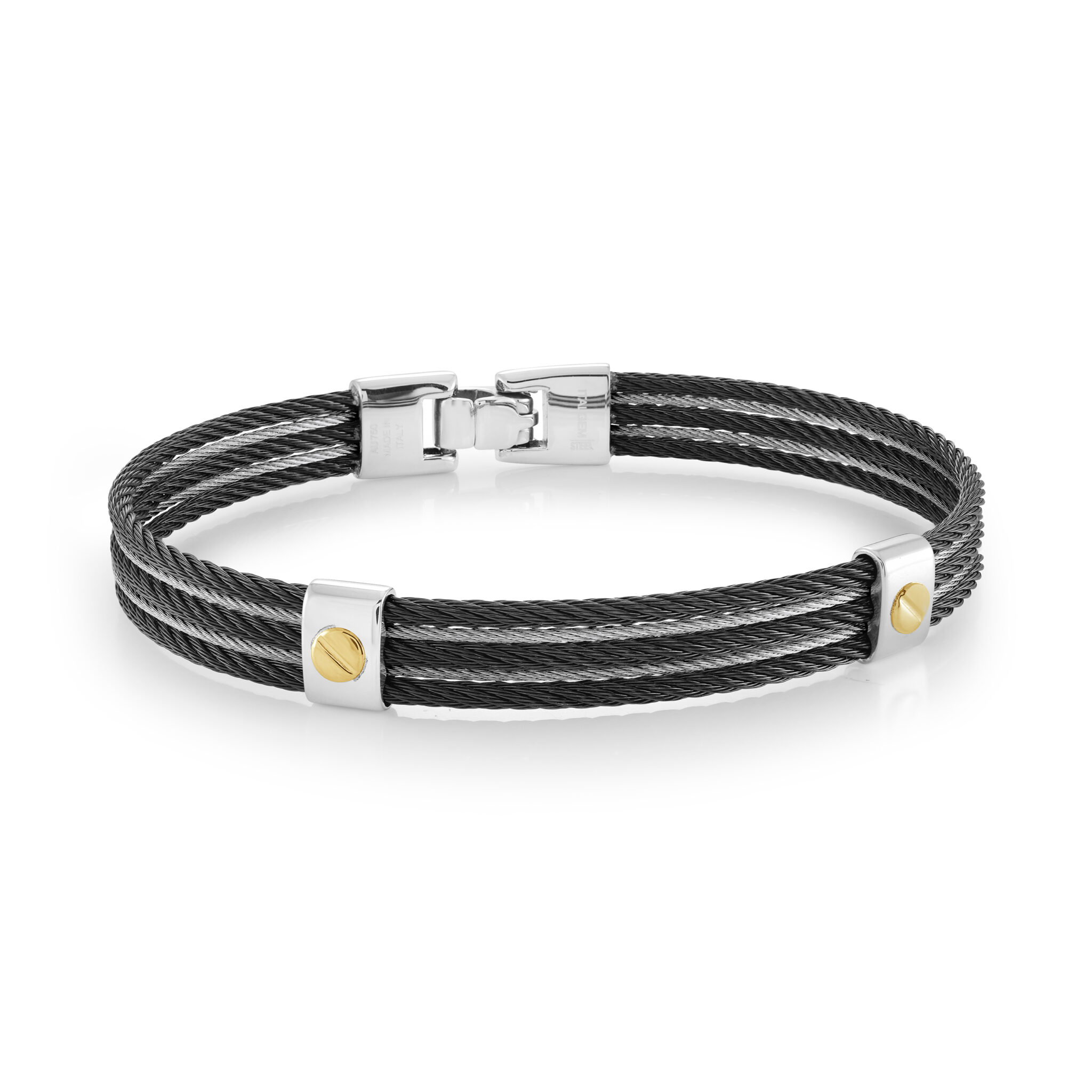 A bold five-row cable design combines durable black IP stainless steel with luxurious 18K gold accents in this striking bracelet. Its modern aesthetic adds flair to any outfit, making it versatile for both casual and formal occasions. The intricate layering of the cable ensures a comfortable fit, perfect for daily wear.