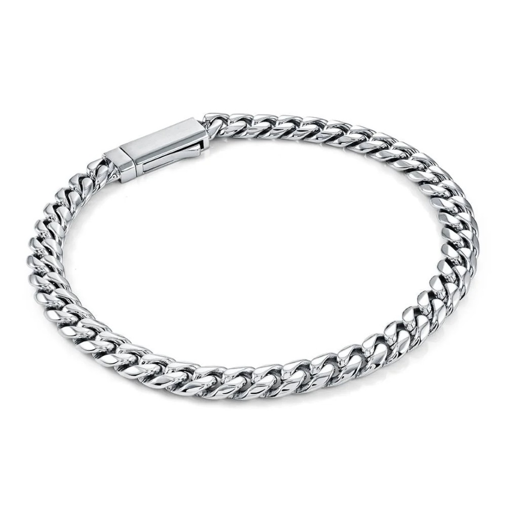A classic curb-style design gives this stainless steel bracelet a confident, everyday presence. Polished links reflect light smoothly, creating a clean, continuous flow around the wrist. The balanced width offers noticeable weight without feeling heavy, making it easy to wear on its own or layered with a watch. A streamlined clasp blends into the profile for a secure, finished look. Understated and versatile, it transitions effortlessly from casual to dressier settings.