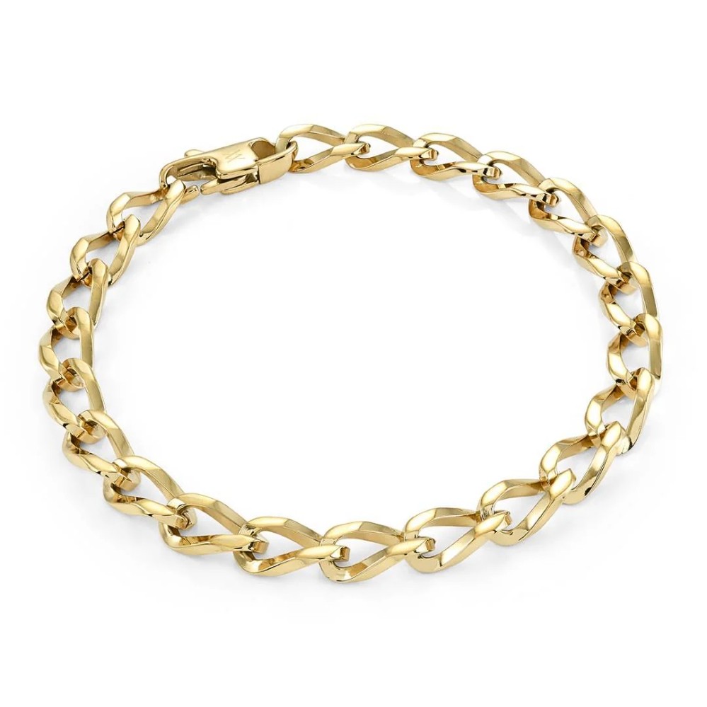 A bold curb-link design delivers presence with a sleek gold-tone finish that stands out without feeling flashy. Each solid stainless steel link is tightly formed for a substantial look and a smooth, confident drape on the wrist. Polished surfaces catch light from every angle, giving the bracelet a sharp, elevated edge. Finished with a secure clasp, it’s a dependable everyday piece that holds its own worn solo or stacked.