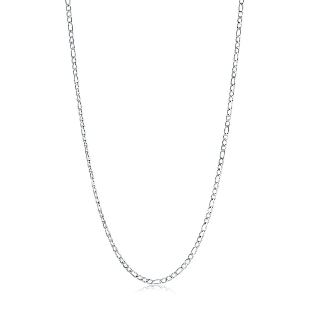 Product Description: A classic Figaro link pattern gives this stainless steel chain its clean rhythm and timeless appeal. Alternating elongated and shorter l