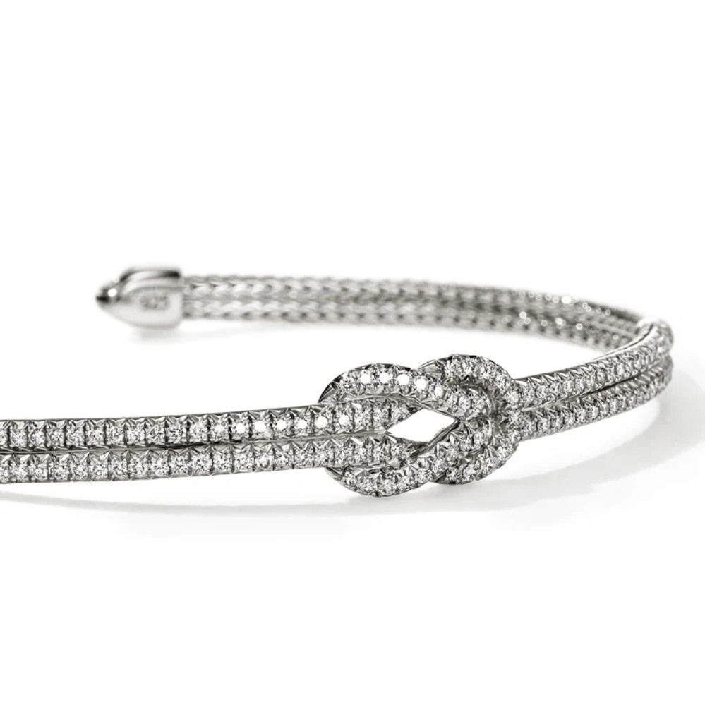 Product Description: A woven silver-toned chain encircles the wrist with supple movement, meeting at a sculpted love knot richly set with round diamonds. The