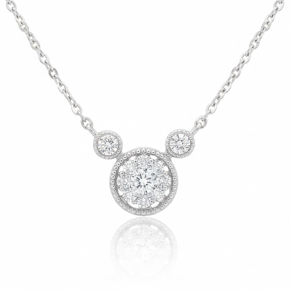 A radiant cluster of diamonds forms the heart of this refined pendant, arranged to create depth and lively sparkle within a softly rounded silhouette. Two bezel-set diamond accents connect the centerpiece to the chain, adding balance and a subtle sense of movement. Delicate milgrain detailing frames the design, lending a touch of vintage texture without overwhelming its clean elegance. The overall look is bright, graceful, and timeless, making it an easy everyday piece with enough brilliance to stand out on its own.