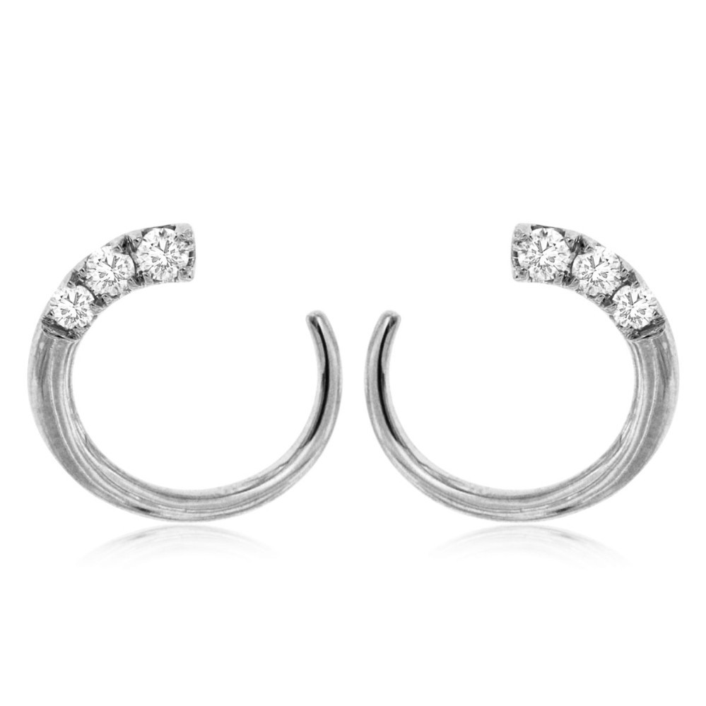 Sculpted in a sleek open-hoop silhouette, each earring features a trio of round diamonds channel-set along the curve for a clean, modern shimmer. The minimal design offers just the right touch of sparkle while maintaining an effortless, contemporary elegance. Perfect for everyday wear or as a polished accent to evening attire, these hoops balance timeless beauty with refined simplicity.