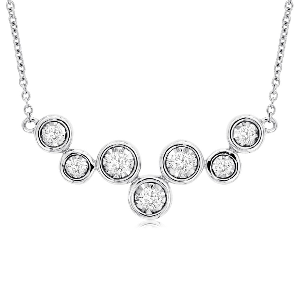 The diamonds form a graceful arc that settles naturally along the neckline, each one framed in a smooth bezel that adds polish without overpowering the sparkle. Light moves easily across the graduated layout, giving the necklace a soft, fluid shimmer as it’s worn. The overall look is refined and modern, offering enough presence to stand alone while still layering beautifully with other pieces.