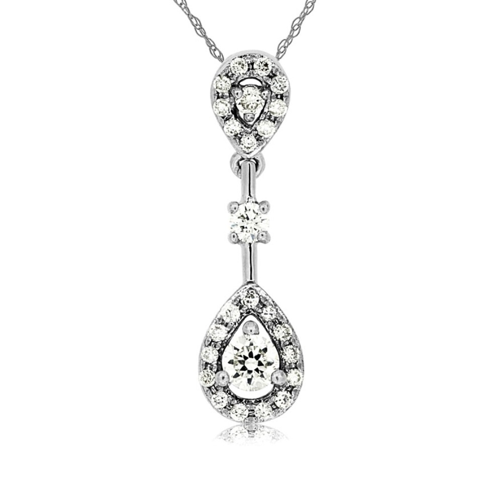 Radiant teardrop motifs give this pendant a softly elongated silhouette, each one framed with a halo of bright diamonds that draw the eye toward the center stones. A single diamond connector adds a delicate sense of movement, allowing the lower drop to catch light with every step. The polished white-gold setting keeps the overall look refined and fluid, balancing sparkle with graceful shape. A timeless choice for someone who loves elegant lines and a touch of vintage charm.