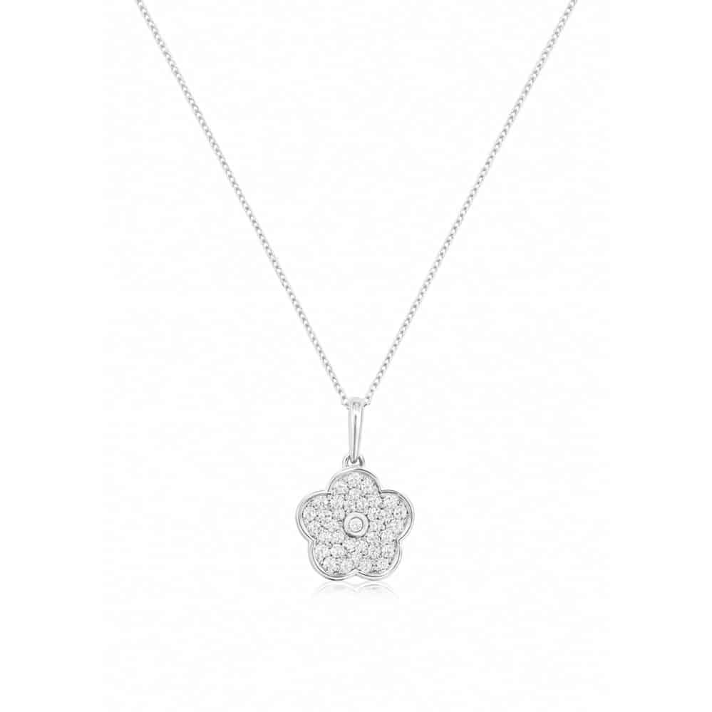 Soft petals shimmer in a clustered bloom, giving this diamond pendant a delicate, uplifting glow. Each curve of the flower is traced with pavé stones that catch light from every angle, creating a bright, airy feel against the polished white gold. The gentle domed center adds dimension without overwhelming the design.