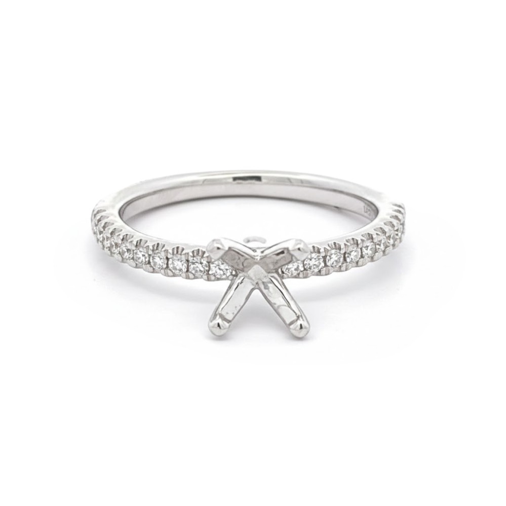 Product Description: A slender white gold band lined with round diamonds creates a bright, continuous ribbon of light along the finger. The accents are set in a shared-prong style, allowing each stone to catch and reflect light with lively brilliance while maintaining a delicate profile. At the center, a classic four-prong head rises gracefully, ready to secure the diamond of your choice. Clean, balanced, and timeless in feel, this semi-mount offers a refined foundation for a truly personal engagement ring.