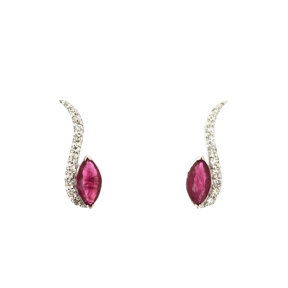 A graceful sweep of white metal curves upward, set with a line of round diamonds that lead the eye to a vivid marquise-shaped ruby. The ruby’s rich red hue creates a striking contrast against the bright diamonds, adding depth and warmth to the design. The elongated silhouette gives these earrings a fluid, elegant presence, with movement that catches the light from every angle. Refined yet expressive, they offer a bold pop of color balanced by classic diamond brilliance.