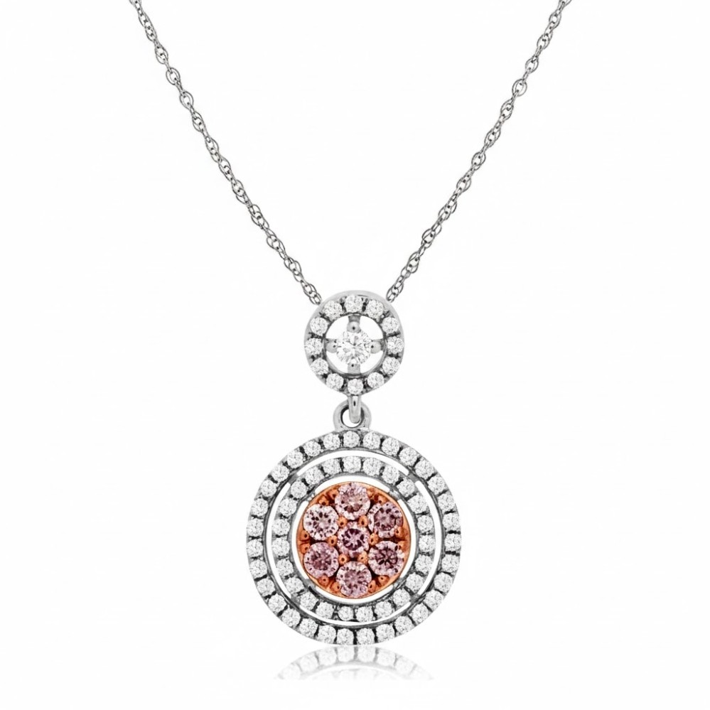 Product Description: Soft blush diamonds glow at the center of this circular design, clustered within warm rose-toned gold that enhances their delicate color. A double halo of round white diamonds surrounds the center, creating striking contrast and remarkable brilliance with every movement. Above, a coordinating diamond-accented drop connects the pendant to the chain, adding balance and fluidity to the silhouette. Crafted in white gold, the interplay of cool and warm tones gives this piece depth, dimension, and a refined yet eye-catching presence.