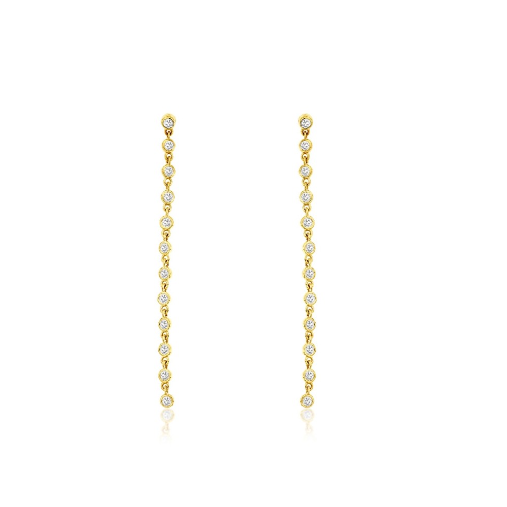 Elegant and fluid, these diamond earrings feature a continuous line of bezel-set round brilliant diamonds cascading in a delicate drop. Each stone is linked in warm 14-karat yellow gold, allowing subtle movement that catches the light with every turn. The refined simplicity of the design makes them a timeless addition to any collection—equally striking for evening wear or adding everyday sophistication.