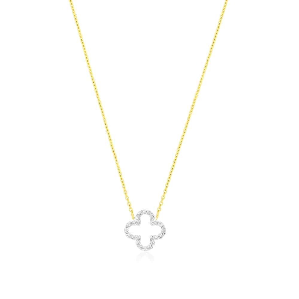 A soft quatrefoil silhouette sparkles with round diamonds in this elegant necklace. The open design and curved lines create a refined balance of light and space, while the yellow gold chain adds warmth and contrast. Sophisticated yet versatile, it’s a timeless accent that layers beautifully or stands gracefully on its own.