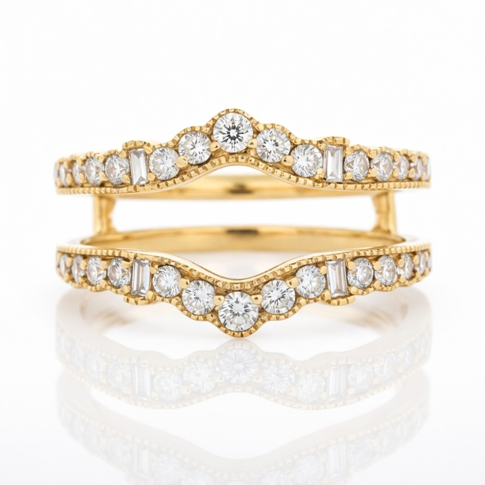Two gently contoured diamond bands mirror one another in a refined chevron silhouette, creating a balanced, architectural look when worn together. Alternating round and baguette-cut diamonds trace each curve, adding crisp flashes of light and visual rhythm along the yellow gold setting. Fine milgrain edging softens the geometry and lends subtle texture throughout. Designed to frame a center ring or stand alone as a statement, the pair delivers structure, sparkle, and elegant symmetry without feeling heavy.