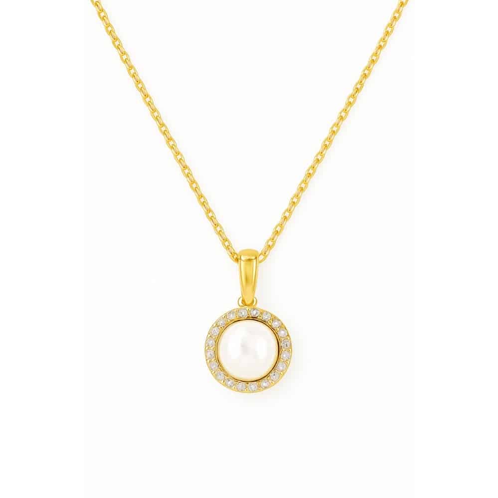 A luminous pearl rests at the center of this pendant, its smooth glow framed by a delicate halo of round diamonds. The contrast between the soft luster of the pearl and the crisp sparkle around it gives the piece a balanced, elegant shine. A polished yellow gold bail adds warmth and height, letting the pendant hang with a clean, timeless grace that suits both everyday wear and more refined occasions.