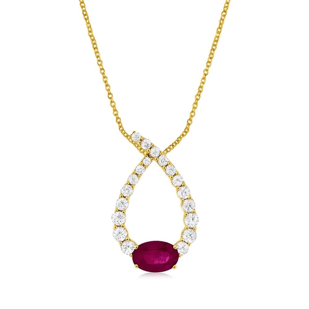An oval ruby glows with captivating color at the base of this teardrop-shaped pendant, surrounded by a cascade of brilliant diamonds set in yellow gold. The sweeping design draws the eye toward the vivid center stone, creating a stunning balance of fire and form. Elegant and timeless, it’s a piece that embodies both strength and grace.