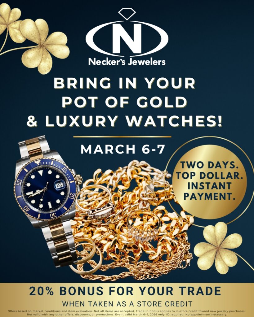 Luck is on your side this March! For two days only, we’re hosting a Pot of Gold buying event at our DeWitt and Davenport locations – bringing top market pricing, expert evaluations, and immediate payment for your valuables. Plus, enjoy a 20% bonus when you trade in during the event toward new jewelry.
