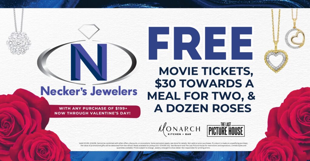 It’s the perfect trio for romance — a touch of elegance, a shared meal, and a night of laughter or love on the big screen. Surprise your special someone with a gift that goes beyond jewelry — an entire Valentine’s experience, all made possible by Necker’s Jewelers.